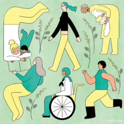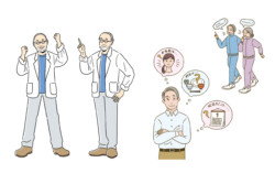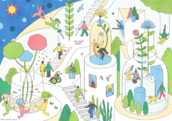 「人生100年時代」をテーマに、健康な暮らしや研究をモチーフにしました。100の数字を遊び心とともに散りばめ、明るい未来を描いています。