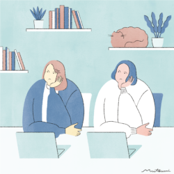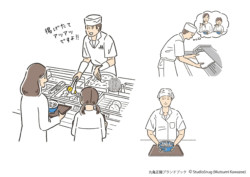 あわただしい時もあるけれど、心地よい時間と共に働く人々の姿を描きました。とろける時計や植物の時計など、ユーモラスなモチーフを添えて。