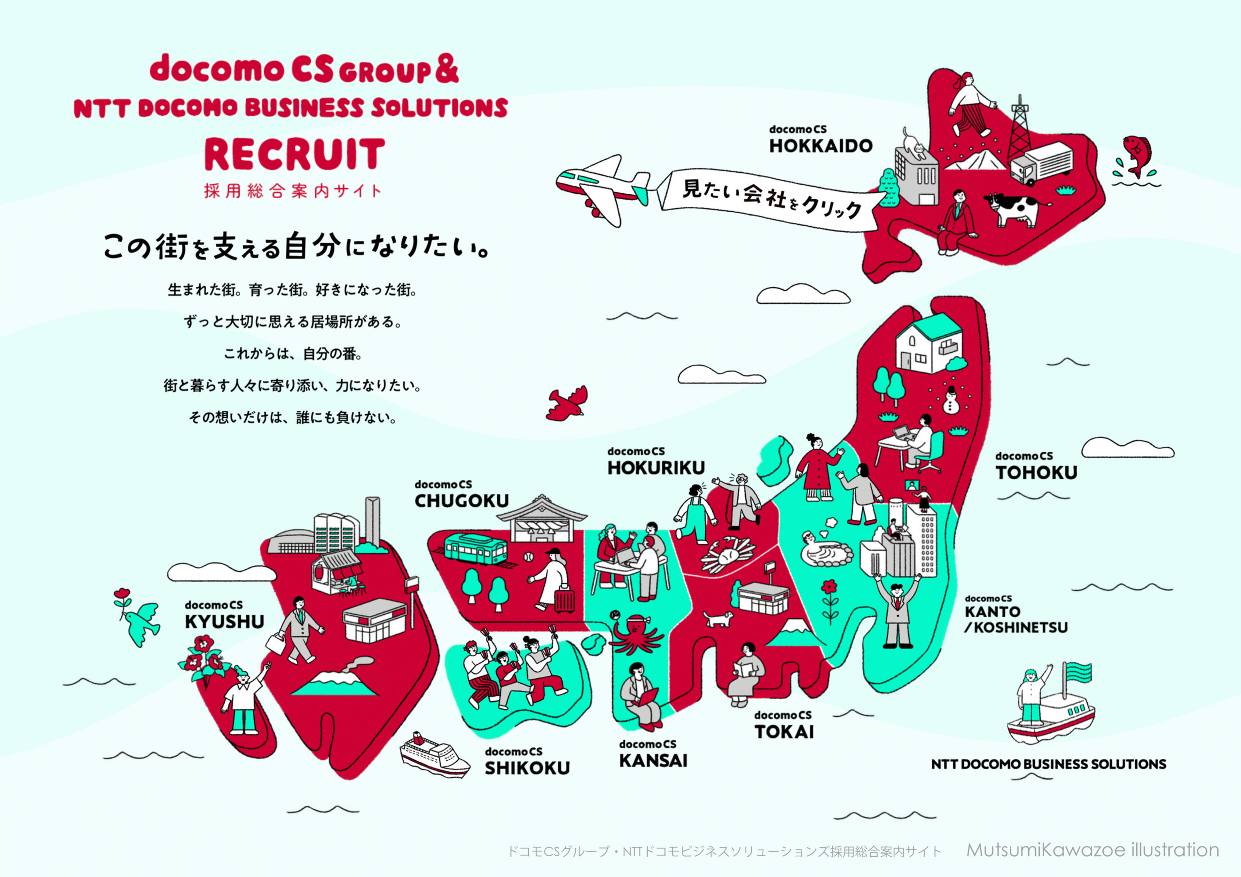 2023年からドコモCSグループ・NTTドコモビジネスソリューションズ採用サイトのメインビジュアルを担当しています。地域のモチーフや人々の姿を日本地図に散りばめて、「自分の街で働く未来」を表現しています。https://information.nttdocomo-fresh.jp/csgroup/