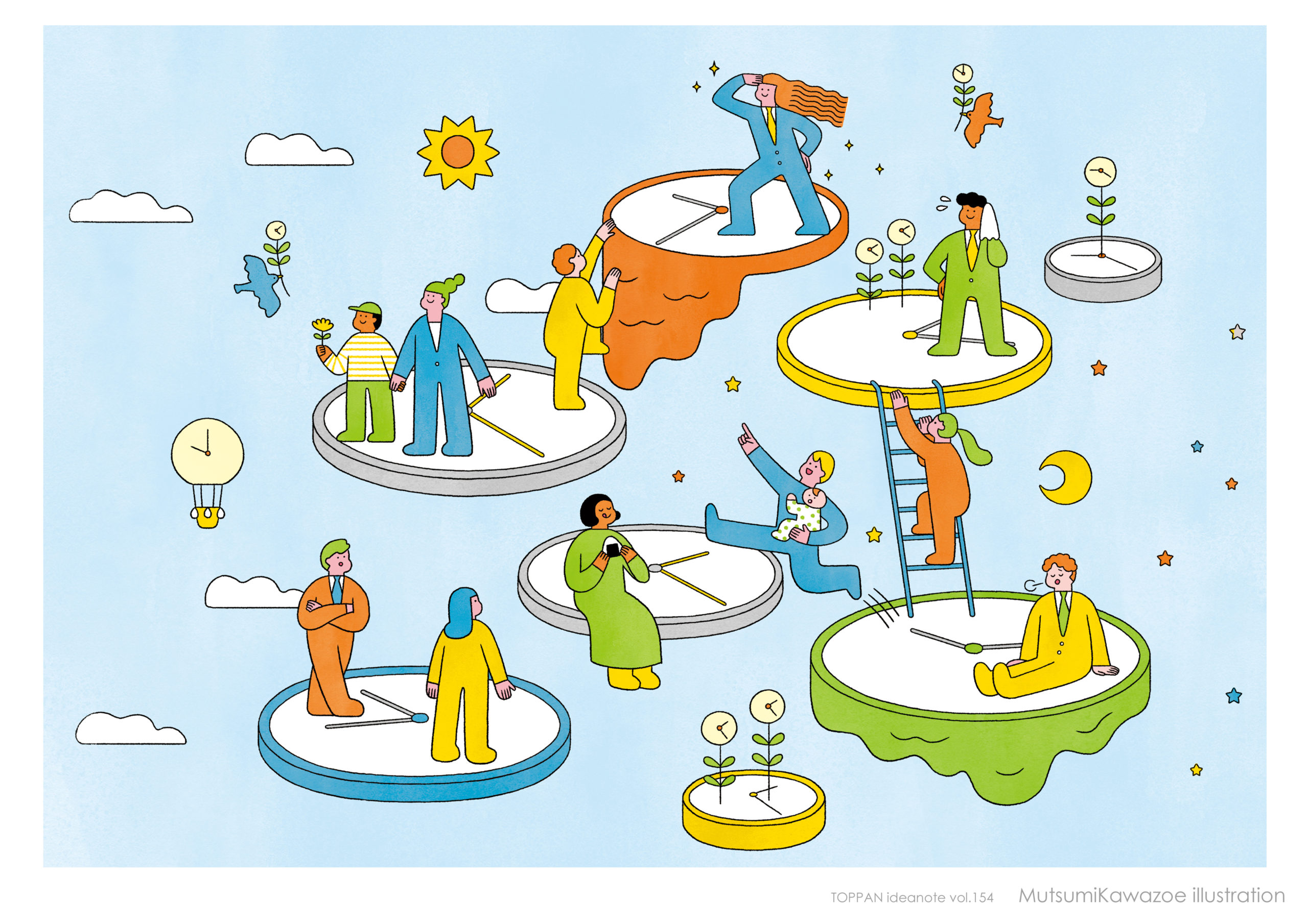 あわただしい時もあるけれど、心地よい時間と共に働く人々の姿を描きました。とろける時計や植物の時計など、ユーモラスなモチーフを添えて。