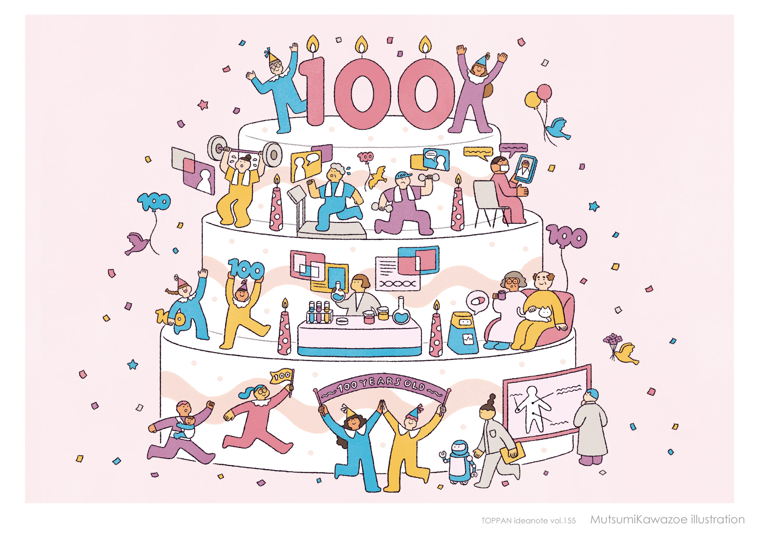 「人生100年時代」をテーマに、健康な暮らしや研究をモチーフにしました。100の数字を遊び心とともに散りばめ、明るい未来を描いています。