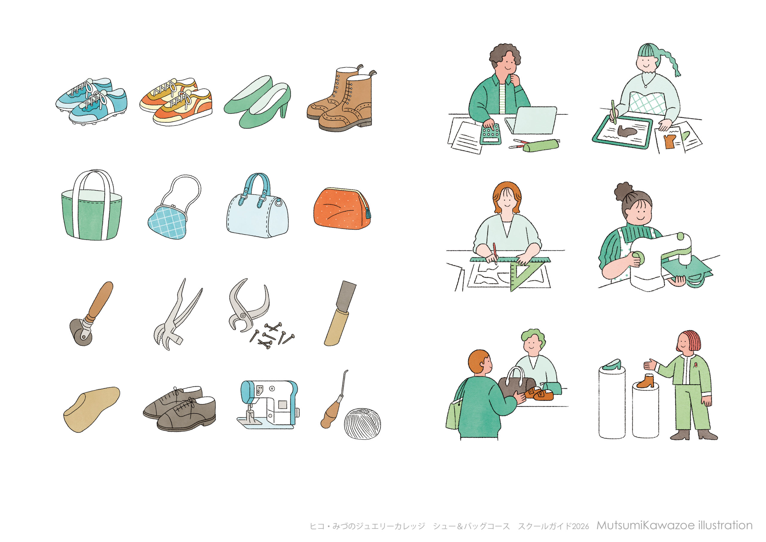 ヒコ・みづのジュエリーカレッジ シュー&バッグコース「スクールガイド2026」のイラストを担当しました✍️ 表紙にはシューズやバッグと道具を、卒業生ページにはやりがいを持って働く姿を。おしゃれで伝わる表現を意識しています。